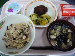 小豆ごはん、いしる煮、鯖のみそ揚げ、柿なます、牛乳