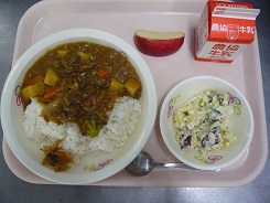 カレーライス、おさつサラダ、副神漬け、りんご、牛乳