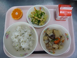 菜めし、いりどり、ホロホロ和え、いよかん、牛乳