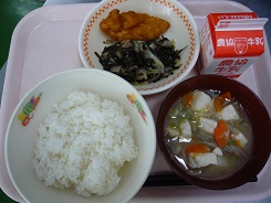 ごはん、とりのから揚げ、なます、みそ汁、牛乳