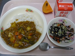 カレーライス、大根サラダ、福神漬け、柿、牛乳