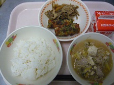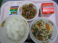 ごはん、とり野菜、竹輪の磯辺揚げ、きんぴら、牛乳