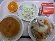 胚芽食パン、ポトフ、おさつサラダ、みかん、牛乳
