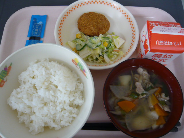 ごはん、ミンチカツ、ポテトサラダ、のっぺい汁、牛乳