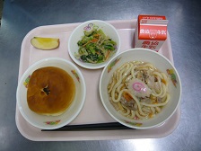豆パン、肉うどん、ごま和え、りんご、牛乳