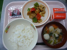 ごはん、酢豚、みそ汁、みかんゼリー、牛乳