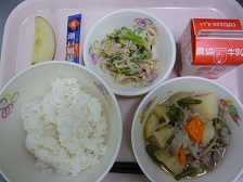 ごはん、肉じゃが、ツナサラダ、りんご、ふりかけ、牛乳