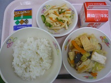 ごはん、豆腐のカレー煮、ごま和え、牛乳