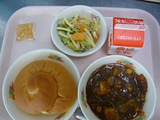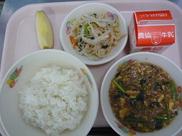 ごはん、麻婆豆腐、五目なます、りんご、牛乳