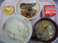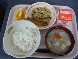 ごはん、いわしの生姜煮、五目豆、豚汁、いよかん