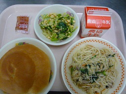 ミルクロール、焼きビーフン、シーフードサラダ、マーガリン、牛乳