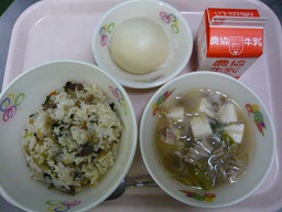 菜めし、とりのから揚げ、白菜のおかか和え、のっぺい汁、牛乳