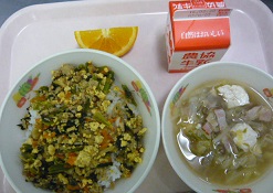 そぼろごはん、千切りスープ、オレンジ、牛乳