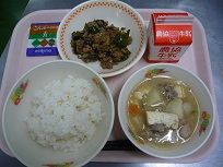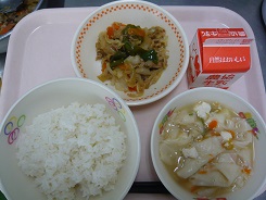 ごはん、回鍋肉、ワンタンスープ、牛乳、