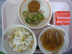 ちらしずし、そうめん汁、ミンチカツ、ごま和え、牛乳