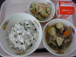 ワカメごはん、肉じゃが、ツナサラダ、牛乳