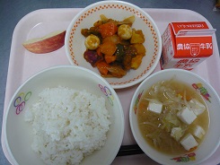 ごはん、酢豚、みそ汁、りんご、牛乳