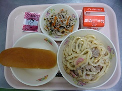 コッペパン、五目うどん、磯香和え、クリーム、牛乳