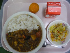 夏野菜カレー、コーンソテー、冷凍みかん、牛乳