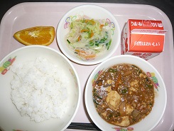 ごはん、麻婆豆腐、中華和え、オレンジ、牛乳