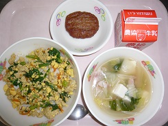 そぼろごはん、豆腐スープ、ハンガーグ、牛乳