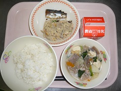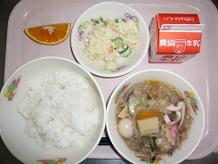 ごはん、イカのかりん揚げ、キャベツサラダ、のっぺい汁、牛乳