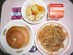 ミルクロール、スパゲティソテー、フルーツポンチ、クリーム、牛乳