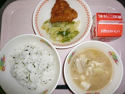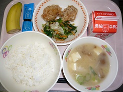 ごはん、とりのから揚げ、白菜のおかか和え、みそ汁、のりの佃煮、バナナ、牛乳