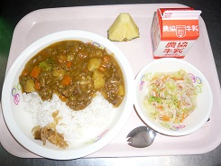カレーライス、大根サラダ、福神漬け、パイナップル、牛乳