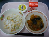 夏野菜カレー、コーンソテー、冷凍みかん、牛乳