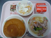 ミルクロール、ポトフ、フルーツポンチ、ナッツと小魚、牛乳