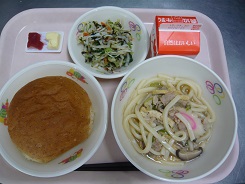 胚芽パン、肉うどん、磯香和え、ジャムマーガリン、牛乳