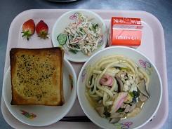ごまトースト、五目うどん、カミカミサラダ、いちご、牛乳