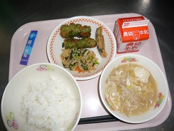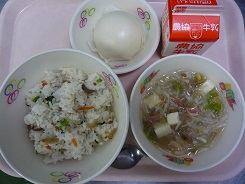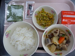 ごはん、イカのカリン揚げ、揚げかぼちゃ、飛鳥汁、牛乳