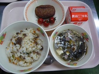 ワカメごはん、たまごとじ、五目きんぴら、牛乳