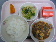 ごはん、麻婆豆腐、ホロホロ和え、柿、牛乳