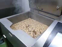 まるごとのかぼちゃは、切るのがとても大変です。学校にはかぼちゃカッターはないので、今日はスチームコンベクション100℃5分で加熱してから切りました