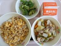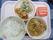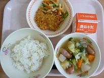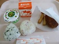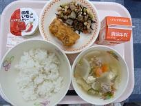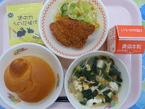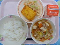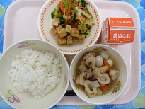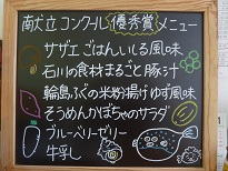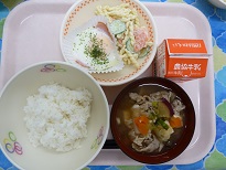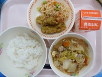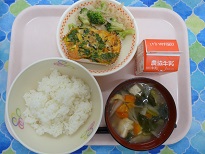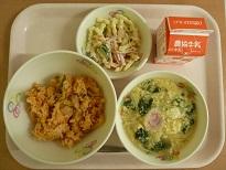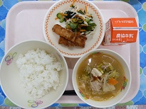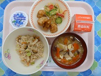 輪島産の米粉と片栗粉をブレンドした衣をつけて揚げましたかきたま汁には、輪島産茎わかめとしいたけ、サラダにも町野産のアスパラガスを使い、地場産物いっぱいの給食になりました