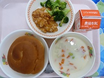 豆パンには金時豆の甘煮が入っています。子どもたちの中には、豆パンが苦手という子もいるので、豆の効能を知って食べてもらうため、今日の健康委員会の給食ひとくちメモの放送は、金時豆についてのお話にしました
