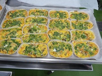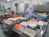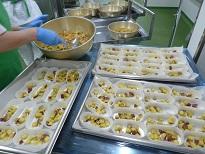 給食のハムエッグはカップにハム、卵を入れてスチームをかけて作っています