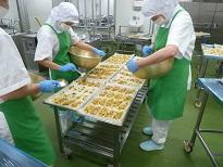 ミートソースはたっぷりの玉ねぎからの水分で、水は一滴も使わず作り、大食缶に配缶しました。麺は二釜に分けて茹でて、オリーブオイルとパセリを回しかけてミニ食缶に配缶しました。