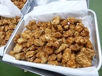 しょうゆ、みりん、砂糖を軽く煮詰めて作った甘辛いたれにからめます。