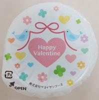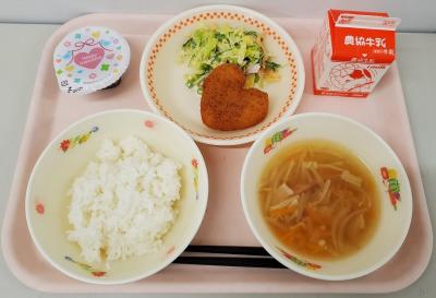 給食室から生徒の皆さんへ『いつも残さず きれいに食べてくれて ありがとう♥』の感謝の気持ちを込めて、ハートのコロッケとチョコプリンを贈りました。