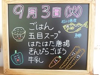 9月3日(火)の給食 投稿日時 : 2019/09/03 wajimj *ごはん*五目スープ*石川県産はたはた唐揚げ*きんぴらごぼう*牛乳 きんぴらごぼうは、ごぼう、にんじん、豚肉、ピーマン、しらたきを使って、少し濃いめの味付けにしたので、ごはんに合わせて食べやすくなりました 五目スープは小松菜、にんじん、もやし、ベーコン、玉ねぎと具だくさんにして、こちらは薄味に仕上げました 今日も残食は少なかったです Tweet {{options.likeCount}} {{options.likeCount}} 0 コメント