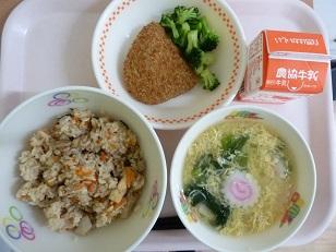 今日の給食では、さいの目切りの豚肉と里芋、にんじん、しいたけ、ひじき、油揚げを煮て、さくら飯に混ぜました。