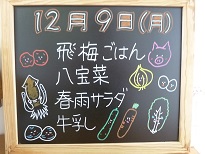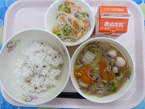 12月9日(月)の給食 投稿日時 : 2019/12/09 wajimj *飛梅ごはん*八宝菜*春雨の中華サラダ*牛乳 今日のごはんには、小さく刻んだ梅干しを混ぜてあります白いごはんに紅いつぶつぶが可愛いごはんです 八宝菜はスルメイカ、あさり、豚肉、うずら卵、たけのこ、にんじん、白菜、小松菜、もやし、玉ねぎを使っています。玉ねぎをたっぷり入れたので、自然な甘さが出ていて、素材から出る味で薄味でも美味しく食べられました Tweet {{options.likeCount}} {{options.likeCount}} 0 コメント
