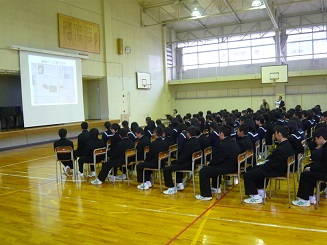 1年生は4限目に体育館で地域について知ろう「輪島の水産業」の講演会を行いました。