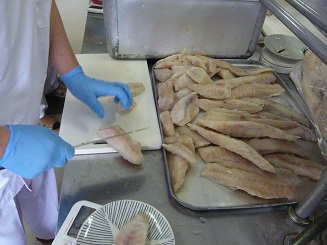 今日の給食は輪島産の真フグです。輪島は日本でも有数のふぐの漁獲高です。でも、ふぐには毒があるのでさばくためには免許が必要です。JFいしかわ輪島支所ではH27年6月に水産加工施設を設立しました。そこでは免許を持った人がいます。フグを切り身にして提供してくださいました。