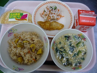 輪島産ふぐ、穴水産栗、石川産さつまいも、輪島産コシヒカリ、能登産卵、牛乳でした。