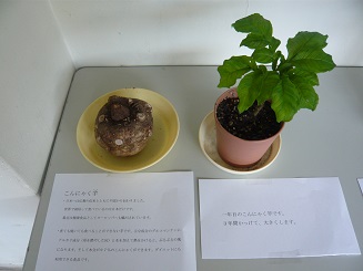 煮ても焼いても食べることができない芋です。主な成分のグルコマンナンにアルカリ成分(草などの植物を燃やした灰)と水を加えて熱をかけると、プルプルの塊になります。水分97%のダイエット食品になります。